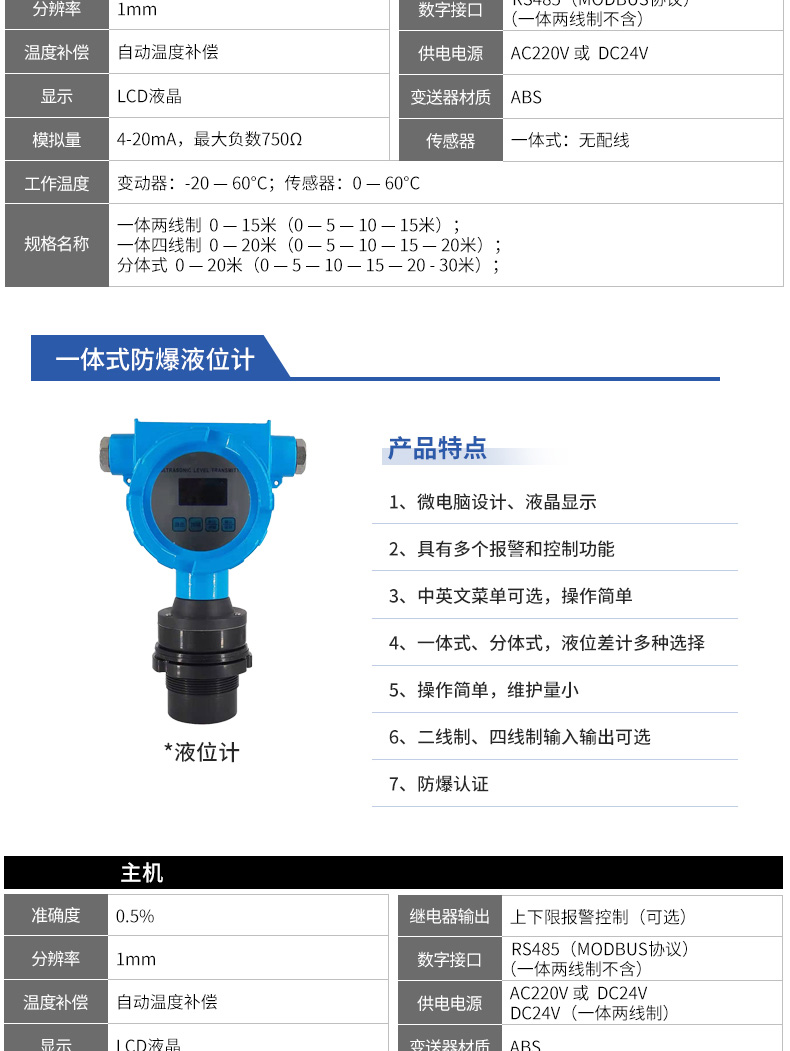 一体式超声波液位计是用于测量非标准涵洞、渠道、开口排放的渠道液体流量的仪表可广泛用于污水治理流入和排放渠、工矿企业化工液体、废水排放渠道水利工程和农业灌溉用渠道、泄洪闸门等场合流量测量